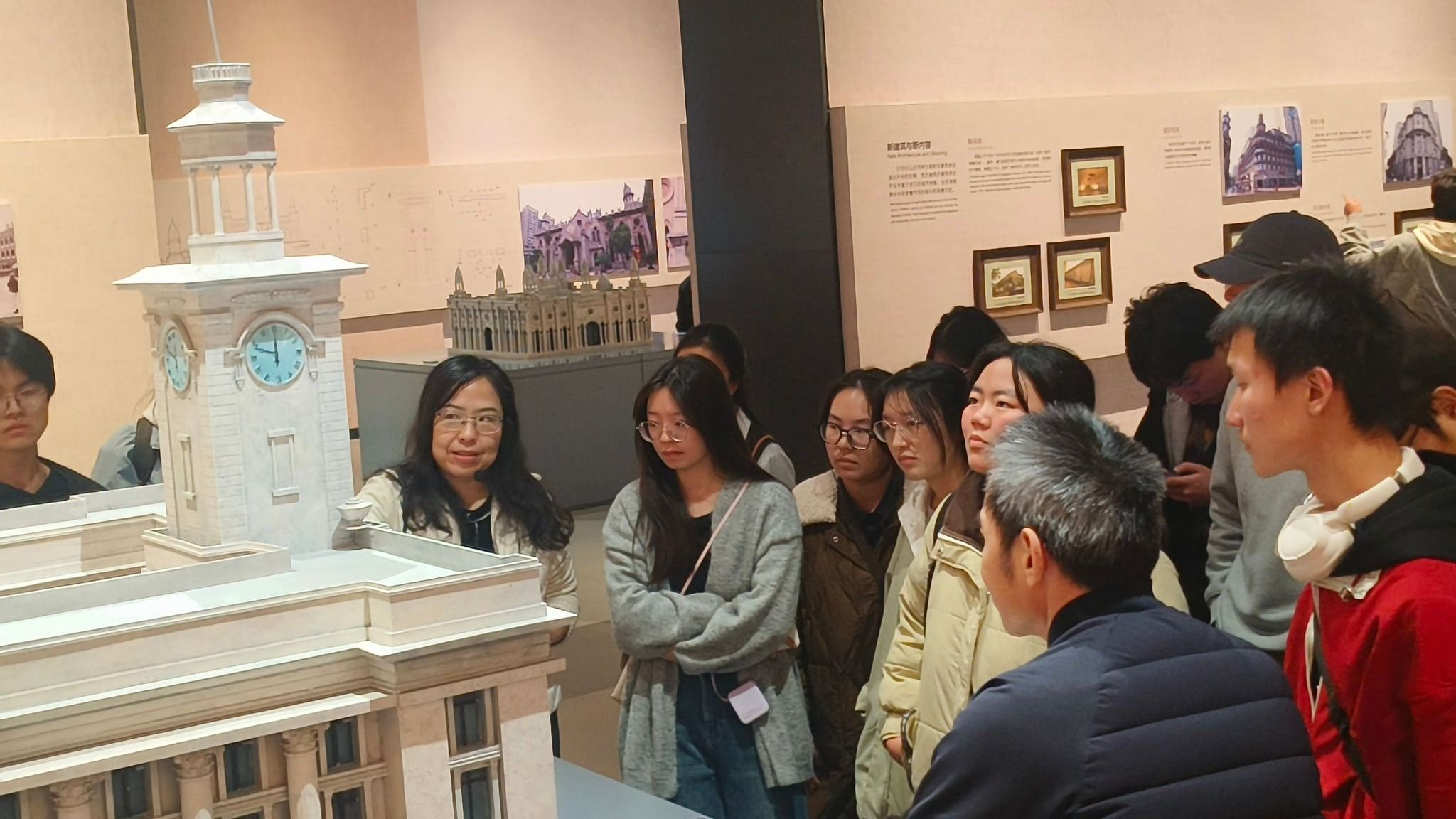 参观过程中,班主任结合展品特色与专业知识,适时为同学们解读不同时期建筑的设计理念、结构逻辑及文化内涵,帮助大家打破课本知识的边界,更直观地理解建筑背后的工程原理与人文价值。同学们全程专注投入,并围绕展品与班主任、同学交流探讨,现场学习氛围热烈浓厚。